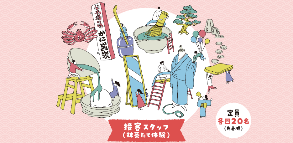 ■体験内容 <おしごとをする際に着用する、お着物の着付け体験> かに道楽様で着用される着物は、着付けの知識は不要です。 <アイスクリームにかける、お抹茶点て体験> かに道楽で提供するアイスクリームには、抹茶がかかっているのですが