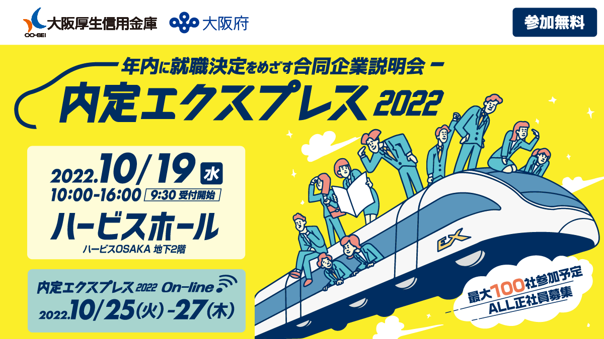 <新型コロナウイルス感染症対策に関して> 当イベントは、新型コロナウイルス感染対策を行った上で開催します。 ・マスクの持参、着用 ・設置のアルコール消毒で適宜手の消毒 ・受付時の検温(37.5℃以上の熱がある場合はご参加いただけません。) ・筆記用具の持参 ・手洗い・咳エチケットの励行 ※発熱や咳、のどの痛み(咽頭痛)などの症状がある方のご参加はお控えください。 【主催】 大阪府(令和4年度OSAKAしごとフィールドにおける総合就業支援業務・コロナ禍における民間人材サービス事業者と連携した緊急雇用対策事業) 【協力】 大阪商工会議所、大阪府中小企業団体中央会、株式会社池田泉州銀行、大阪信用金庫、大阪厚生信用金庫、北おおさか信用金庫、さかいJOBステーション、株式会社アイデム、株式会社学情、ディップ株式会社、株式会社マイナビ 【実施運営事務局】 OSAKAしごとフィールド総合就業支援共同企業体(一般財団法人大阪労働協会/NPO法人HELLOlife/公益財団法人大阪産業局/株式会社パソナ) |