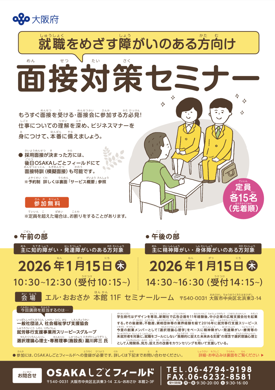 【ご参加いただくみなさまへ】 以下、11点の情報をご提示ください。 webからお申込みいただいた方へは自動返信メールを送信しておりますので、 以下の項目の回答をご入力いただき、2026年1月5日(月)までにご返信くださいませ。 (1)お名前 (2)利用者番号 (3)ご年齢 (4)電話番号 以下の項目は、配慮事項等の確認のため、可能な範囲でご記入ください。 (5)障がい者手帳の種別(身体・療育・精神) (6)等級 (7)診断名 (8)手話通訳の有無 (9)車椅子利用の有無 (10)その他当日配慮が必要な事項 (11)支援者支援機関について(支援機関名・ご担当者名・電話番号・当日同伴の有無) 【その他注意事項】 ・こちらに入力いただいた個人情報は、本イベントの目的及び人材支援に関するサービスの提供や 各種分析等の集計に利用されるものであり、それ以外の目的で使用することはありません。 ・支援者の方の同伴も可能です。ご相談ください。 ・セミナー当日は、<エル・おおさか本館 11F セミナールーム>にお越しください。 ・参加対象に記された条件を満たす方のみ、ご参加いただけます。 ・お申込みされたご本人以外の方が受講することはできません。 ・原則、各セミナーの受講は1回限りです。 ・やむを得ずキャンセルされる場合は、事前にご連絡をお願いします。 ・web申込は前日までにお願いします。当日のご予約はお電話にて承ります。 ご参加いただくみなさまへご協力のお願い ・体調不良時の来館自粛 ・手洗い・咳エチケットの励行 ■OSAKAしごとフィールド 総合受付 06-4794-9198 受付時間:月~金曜 9:30~20:00、土曜 9:30~16:00 |