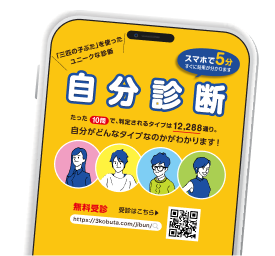 童話「三匹の子ぶた」を使ったユニークな設問10個に回答するだけで12,000通り以上のタイプ分類から、受診者の「特性」、「あなたに向いた業種」、「就活キャッチフレーズ」、「ストレスとの向き合い方」などを詳細に解説します。自分に合った体験先が分からない方は、診断結果の「あなたに向いた業種」と同じ業種を、本サイトの「業種から探す」から探してみましょう。あなたの特性にぴったりの体験先がきっと見つかります!